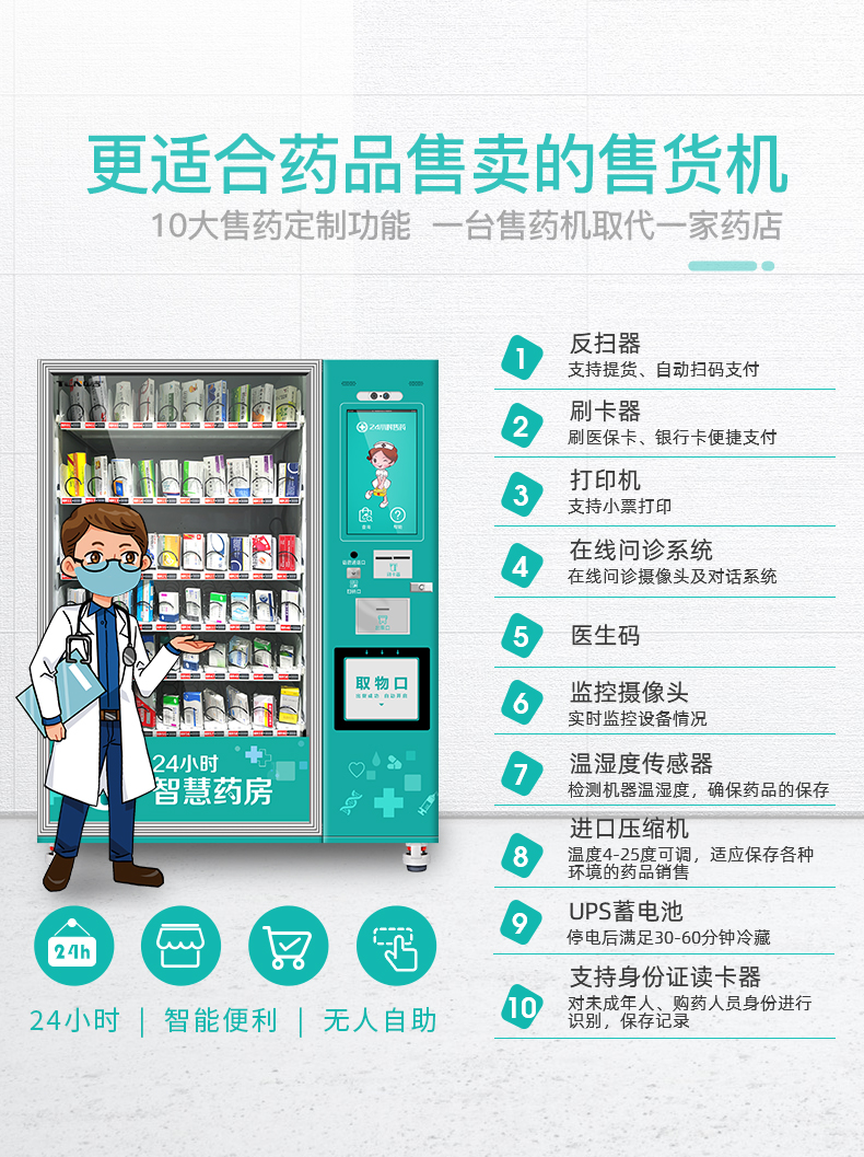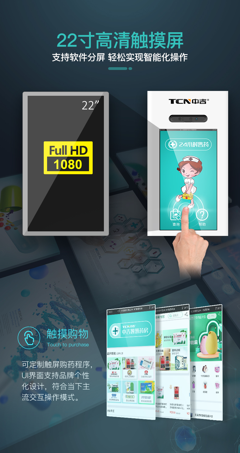中吉智慧医药触屏自助售药机滑式货道24H自助售药站 | 医药品、医药耗材类专业售货机,可选配制冷